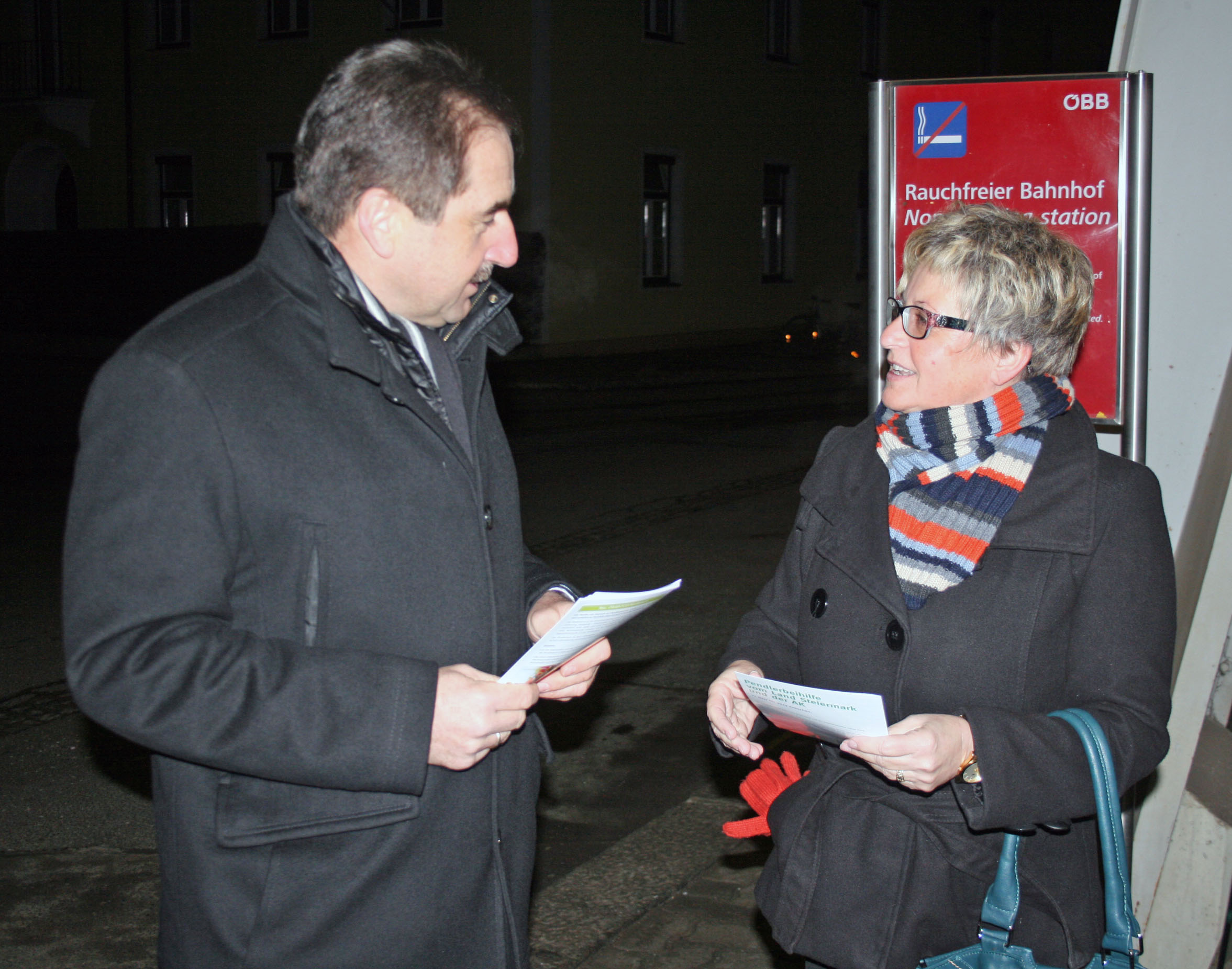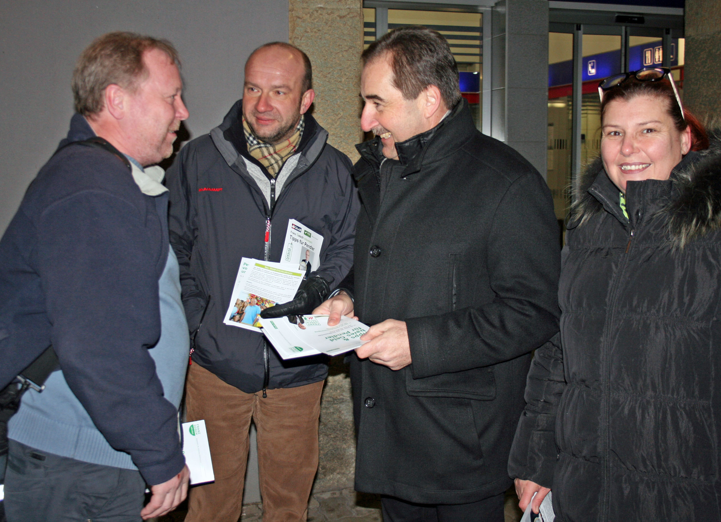 Damit auch die Pendlerinnen und Pendler aus dem Bezirk Murtal eine umfassende Information über die neue verbesserte Pendlerförderung erhalten, wurde ein Pendlerinformationstag durchgeführt. An Bahnhöfen und in mehreren Betrieben präsentierten und informierten die FCG-Kandidaten für die AK-Wahl vom 27. März bis 9. April angeführt von Spitzenkandidat Walter Putz und ÖAAB-Bezirksobmann Bgm. Bruno Aschenbrenner anlässlich einer Verteilaktion die neue Pendlerförderung.