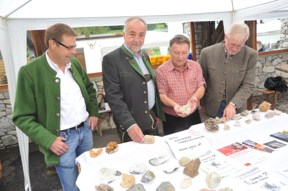 Jedenfalls steckt viel Leidenschaft hinter diesem Hobby, das die Mitglieder des Vereines der Judenburger Mineraliensammler unter der Leitung von Obmann Manfred Lieb alljährlich ins Oberzeiringer Handwerkshaus führt, um hier mit ihren Exponaten zu „glänzen“. Den neben einem tollen „Sightseeing“ wird dem Publikum auch ausführlich Information geboten, Information, die sich die Aussteller selbst in etlichen Fachvorträgen während des gesamten Jahres holen. Zu hochinteressanten Themen übrigens: Über die große Bergkristallkluft im Permafrost der Glocknerwand referierte über Einladung des Judenburger Vereines erst kürzlich der Grazer Universitätsprofessor Franz Walter und zur Frage, ob Metalle der Seltenen Erden das Gold der Zukunft seien, nahm der Fohnsdorfer Montanexperte Hans Jörg Köstler Stellung. Man muß also schon mit Wissen aufmunitioniert sein, um professionelle Antworten auf die vielen Fragen der Börsenbesucher geben zu können. Unter ihnen auch Labg. Hermann Hartleb, der mit den Bürgermeistern von Oberzeiring und Pusterwald, Alois Mayer und Julius Koini einen Abstecher in die Mineralien-Welt unternahm, die sich den Gästen nicht nur im Oberzeiringer Handwerkshaus sondern auch in dessen Hof eröffnete. „Für Oberzeiring stellt dieses jährliche Treffen vieler Mineraliensammler ein wichtiges sommerliches Highlight dar, das an die bedeutende bergmännische Geschichte unseres Ortes erinnern soll“, freute sich Bürgermeister Alois Mayer. Wer übrigens beim „Mineralienschmöckern“ nicht fündig wurde, der konnte sich einen Zeiringer Pfennig am originalen Münzstock prägen.