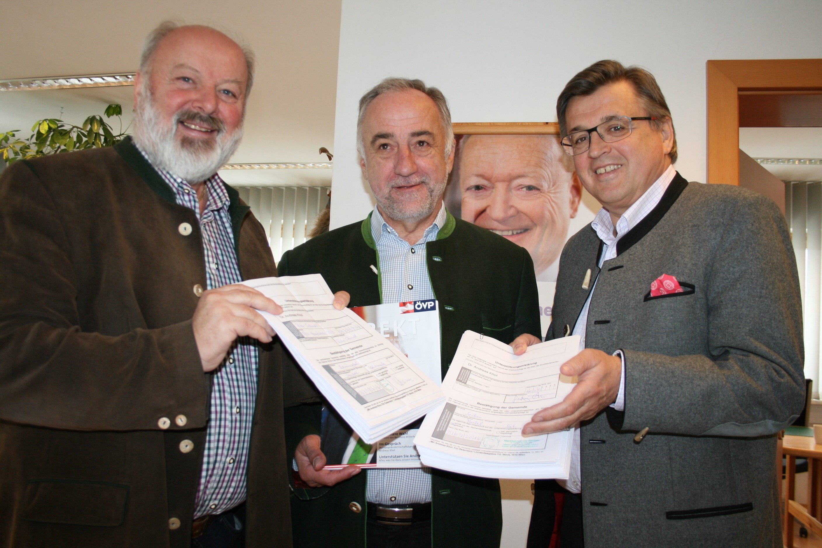 450 Unterstützungserklärungen wurden im Bezirk Murtal für Andreas Khol abgegeben. Die Abgeordneten Hermann Hartleb und Fritz Grillitsch sowie der Geschäftsführer der ÖVP Bezirksleitung Murtal freuten sich über dieses hervorragende Ergebnis und ziehen nun voller Motivation in den Bundespräsidentenwahlkampf.