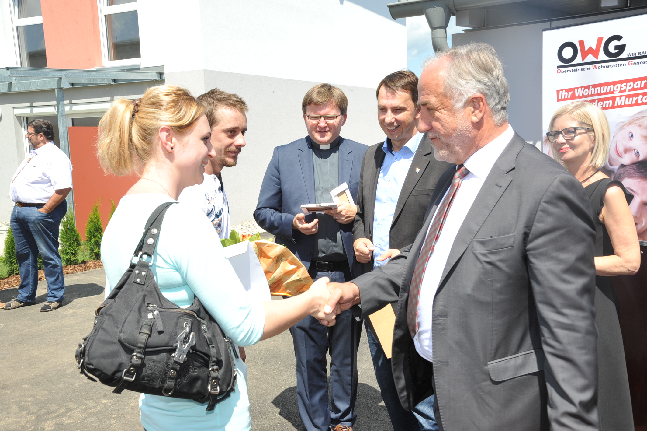 13 Monate Bauzeit waren erforderlich, um dieses Projekt zu realisieren. „Spielberg erweist sich nach wie vor als eine beliebte Wohngegend, der Zuzug hält weiter an“, freute sich Bürgermeister Manfred Lenger, mit dem sich auch dessen Stellvertreter Andreas Themel zur feierlichen Schlüsselübergabe eingefunden hatte. An Pfarrer Rudi Rappel lag es, den „Segen von oben“ zu erbitten, unter den Ehrengästen sah man auch OWG-Aufsichtsratspräsidenten Siegfried Schafarik.