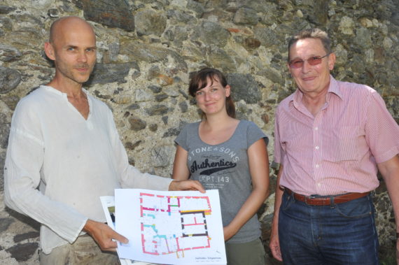 Über die Ergebnisse der heurigen archäologischen und bauhistorischen Untersuchungen informierte Robert Fürhacker: „Nachdem 2016 in einer zweiwöchigen Kampagne eine Küche im Erdgeschoß des Schlosses sowie Teile der Pflasterung im Innenhof und vor dem Nebengebäude untersucht wurden, lag das Hauptaugenmerk der diesjährigen archäologischen und bauhistorischen Untersuchungen auf der barockzeitlichen Eingangssituation in der Südfassade des Schlosses und dem spätmittelalterlichen Nebengebäude. Bei den Ausgrabungen wurde im Torbereich in rund 25 cm Tiefe eine barocke Steinpflasterung mit Entwässerungsrinne aufgedeckt. Diese läuft vom Innenhof des Schlosses nach draußen und diente dazu, das anfallende Regenwasser der Dachflächen aus dem Innenhofbereich des Schlosses abzuleiten.“ Im Nebengebäude standen die zwei Räume des Erdgeschoßes im Mittelpunkt der Untersuchungen. Ziel war es die Errichtungszeit, die Bauabfolge und die Funktion der Räumlichkeiten zu erforschen. Dafür wurde von den Studierenden das Bodeniveau der letzten Nutzungsphase freigelegt, wobei in einem der beiden Räume ein Holzboden zum Vorschein kam. Aufgrund verschiedener Hinweise kann davon ausgegangen werden, dass es sich bei diesem Gebäude zumindest in Teilen um einen ehemaligen Pferdestall handeln dürfte.
