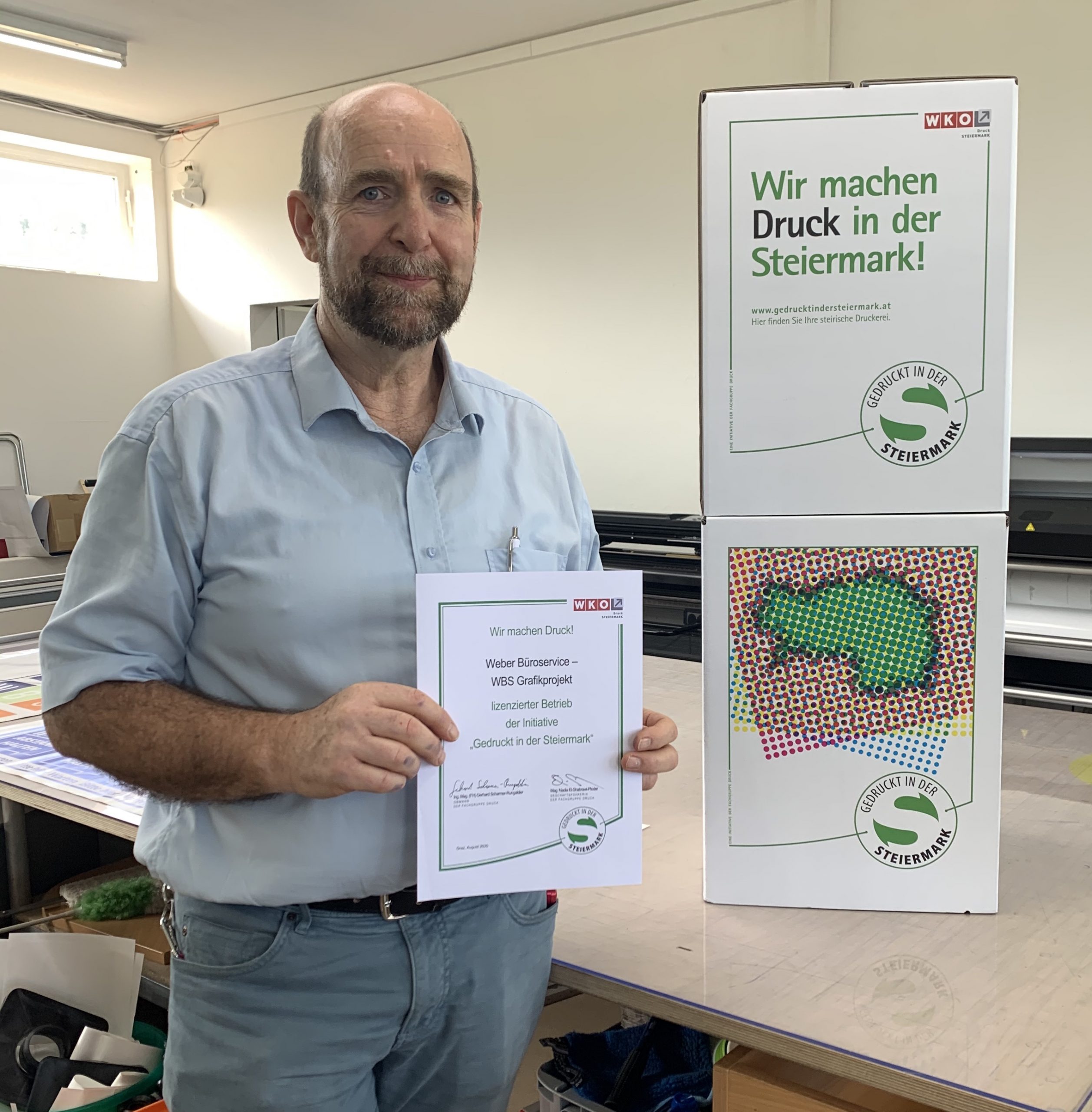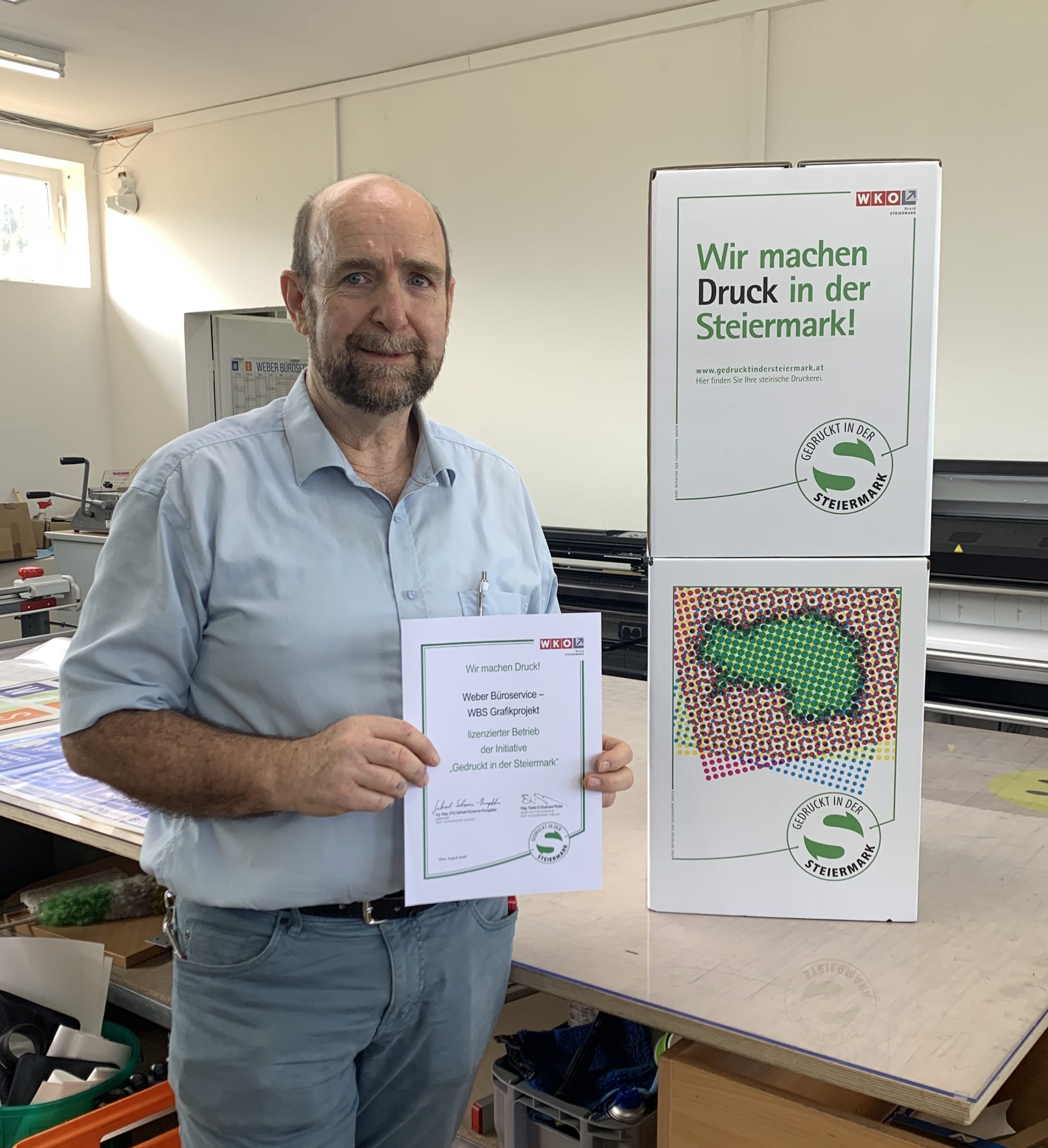 Im Zuge dieser Initiative wurde die Weber Büroservice – WBS Grafikprojekt als lizensierten Betrieb der Initiative „Gedruckt in der Steiermark“ auszeichnet. Kürzlich hat die Urkunde an Josef Karl Weber, Regionalstellenleiter Mag. Michael Gassner in dessen neuen Geschäftsräumlichkeiten in Weißkirchen überreicht.