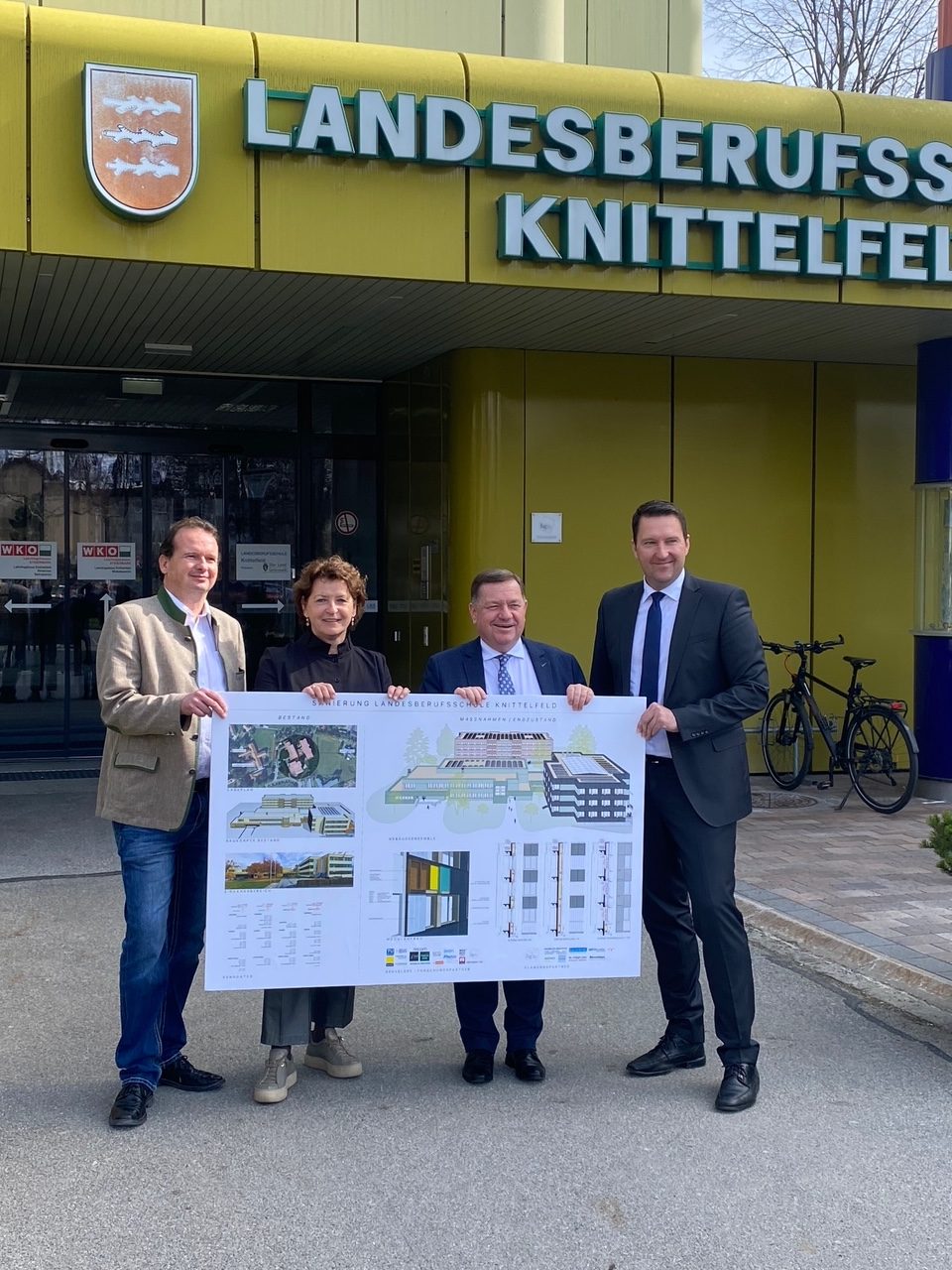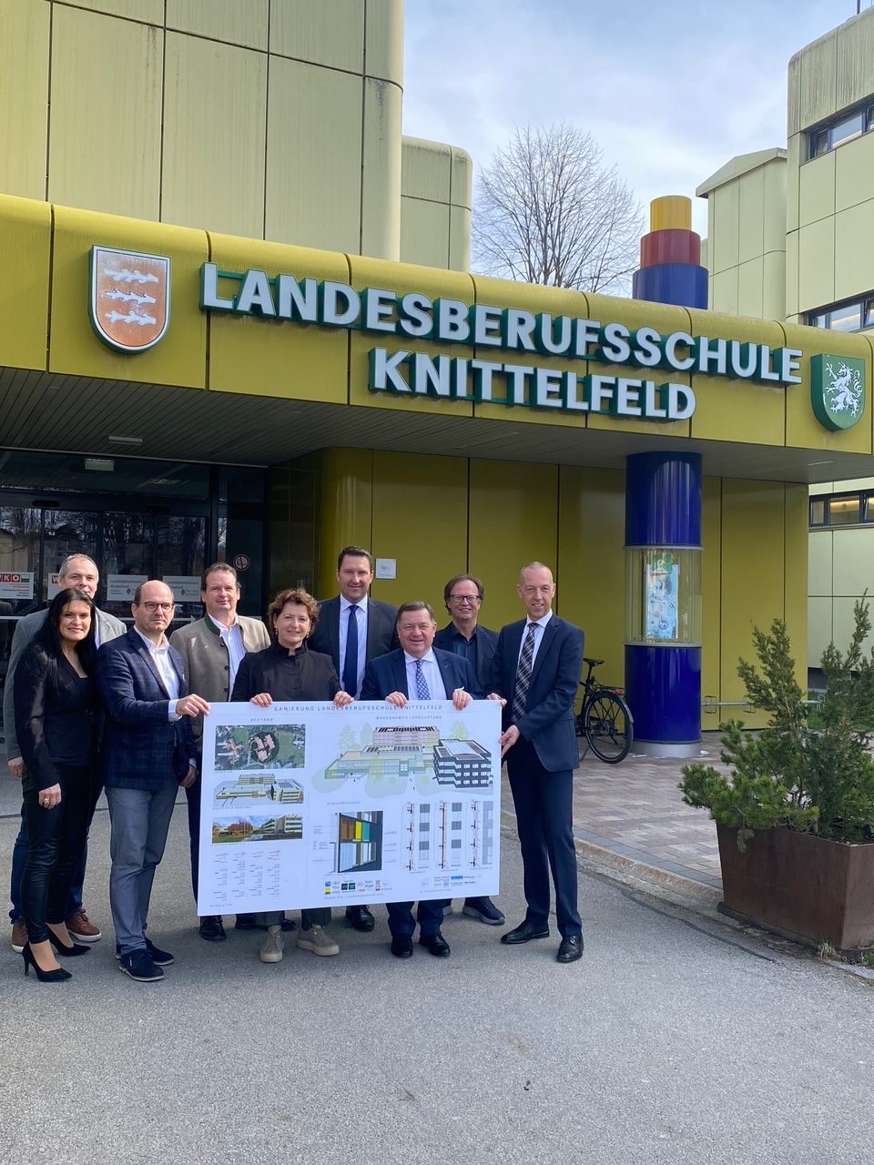 „Es ist ein großer Tag für uns“, versicherten Robert Marchler, Direktor der LBS Knittelfeld, und sein Kollege Alexander Krückl, Direktor des Landeslehrlingsheimes. Gemeint ist der Auftakt zur Generalsanierung zu dem Landesrätin Ursula Lackner und Landesrat Werner Amon angereist sind. Saniert werden mit 13 Millionen Euro die Fassaden von Schule und Heim. „Sie sehen nicht einmal schlecht aus“, hat Carl Skela, Geschäftsführer der Landesimmobiliengesellschaft festgestellt. Wer aber hinter die Fassade sieht, kommt zu einer anderen Meinung. Die alte Fassade weicht einer intelligenten Lösung, wobei laut Skela die ursprüngliche Fassade nicht dumm war, sondern dem damaligen Stand der Technik entsprochen hat. In der neuen, energieeffizienten Fassade ist alles eingebaut, Photovoltaik ebenso, wie Lüftung, Heizung und alle Leitungen. „Das Geld ist gut angelegt, die Sanierung ist auch ein Symbol für die Energiewende“, versicherte die Landesrätin. Mit Beginn der Ferien wird die Sanierung gestartet. Sie macht die Schule in eineinhalb Jahren klimafit.
